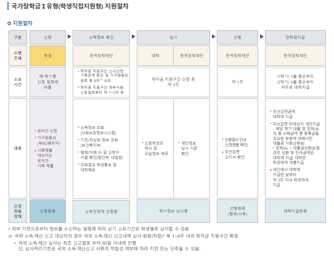 지원절차는 위의 사진과 같이 진행이 되며, 선발이 완료되면 1학기는 3월 중순부터 장학금 지급이 예상되고, 2학기는 9월 중순부터 지급 예정이라고 하네요. 격주로 대학에서 지급한다고 합니다.