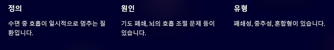 정의 : 수면 중 호흡이 일시적으로 멈추는 질환입니다.