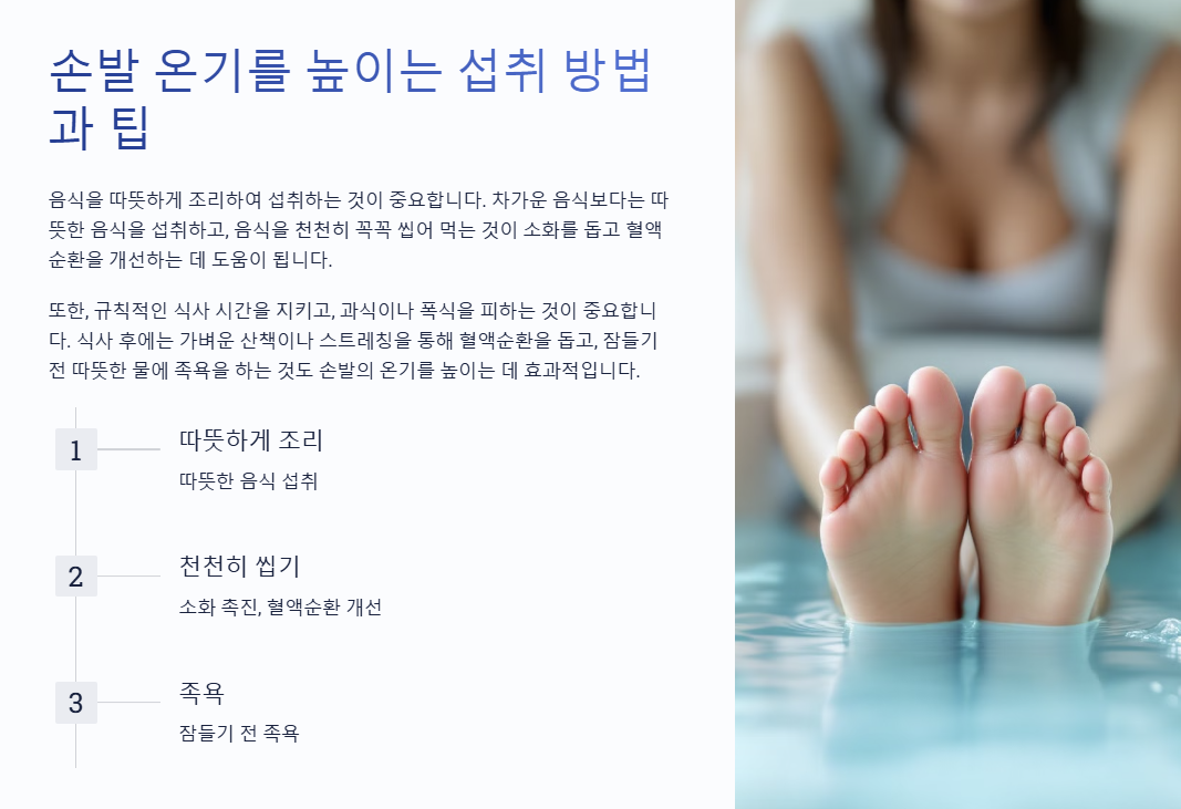 - 족욕 및 반신욕: 따뜻한 물에 발을 담그거나 반신욕을 하면 체온을 높이고 혈액순환을 원활하게 할 수 있습니다.