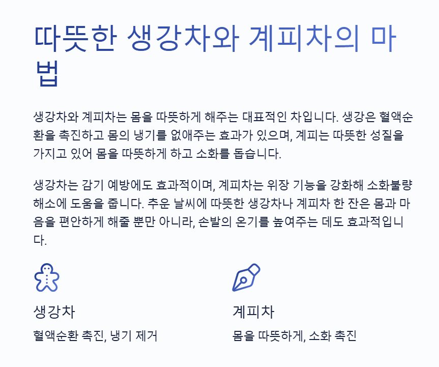 생강은 대표적인 온열 식품으로, 혈액순환을 촉진하고 몸을 따뜻하게 만들어 줍니다. 생강차를 꾸준히 마시면 몸속을 데워주는 효과가 있어 겨울철 손발이 시린 증상을 완화하는 데 도움을 줄 수 있습니다.